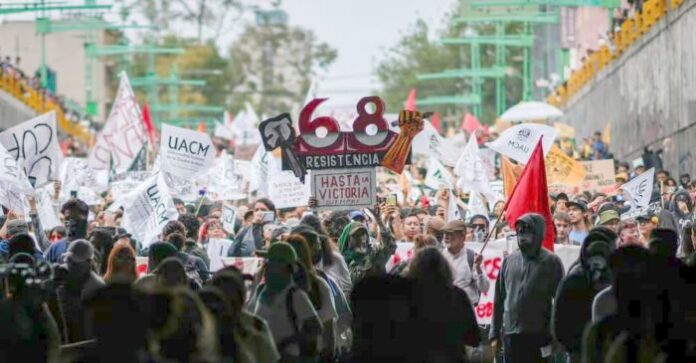 Las consignas se mezclaron con nombres y fechas: “Somos nietos del 68, hermanos de los 43” se escuchó entre pancartas con los rostros de los normalistas de Ayotzinapa, cuyo caso sigue siendo un agujero negro de impunidad a once años de su desaparición.