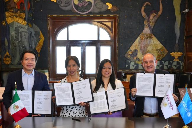 CIUDAD DE MÉXICO.- El secretario de Educación Pública (SEP), Mario Delgado Carrillo, y el representante del Fondo de las Naciones Unidas para la Infancia (UNICEF) en México, Fernando Carrera Castro, firmaron un convenio de colaboración mediante el cual el organismo internacional formaliza su apoyo e impulso a las políticas educativas y de salud en Educación Básica y Media Superior, implementadas por la Presidenta Claudia Sheinbaum Pardo.