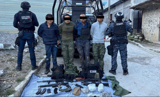 TUXTLA GUTIÉRREZ.— El Ejército Mexicano y agentes de seguridad federales y estatales detuvieron a cuatro presuntos integrantes del Cártel Jalisco Nueva Generación (CJNG), en el municipio de Ixhuatán, Chiapas; esto, luego de que lanzaron amenazas contra autoridades municipales.