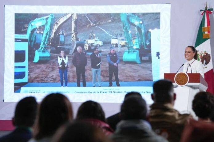 CIUDAD DE MÉXICO.- A través de un enlace desde Palacio Nacional a Baja California Sur, la Presidenta de México, Claudia Sheinbaum Pardo, encabezó el banderazo de inicio de construcción de la Presa “El Novillo” en La Paz, Baja California Sur, que tendrá una inversión entre 2025 y 2027 de 2 mil 400 millones de pesos (mdp), abastecerá 53 litros por segundo y beneficiará a 250 mil habitantes, además de que generará 700 empleos directos y mil 400 indirectos.