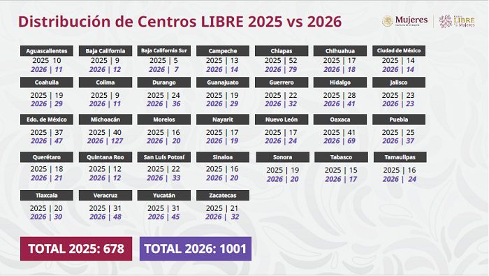 En 2026 se instalarán 323 Centros LIBRE más para contar con un total de 1001 en las 32 Entidades Federativas, que brindarán los servicios de atención integral. Llegando al 40% de la meta sexenal: 2,478 Centros LIBRE