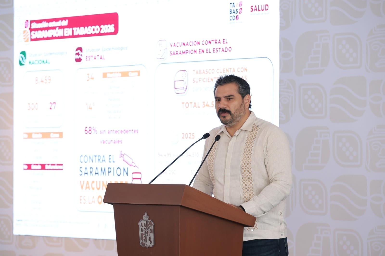 Al presentar el informe de la situación epidemiológica del Sarampión en la entidad, Calderón Alipi recalcó que Tabasco cuenta con suficientes vacunas para reforzar los esquemas, con 34 mil 536 dosis disponibles, y 45 mil 200 dosis más que arribarán este martes. “La vacuna está disponible en todo el sistema de salud a nivel nacional y estatal”, recalcó.