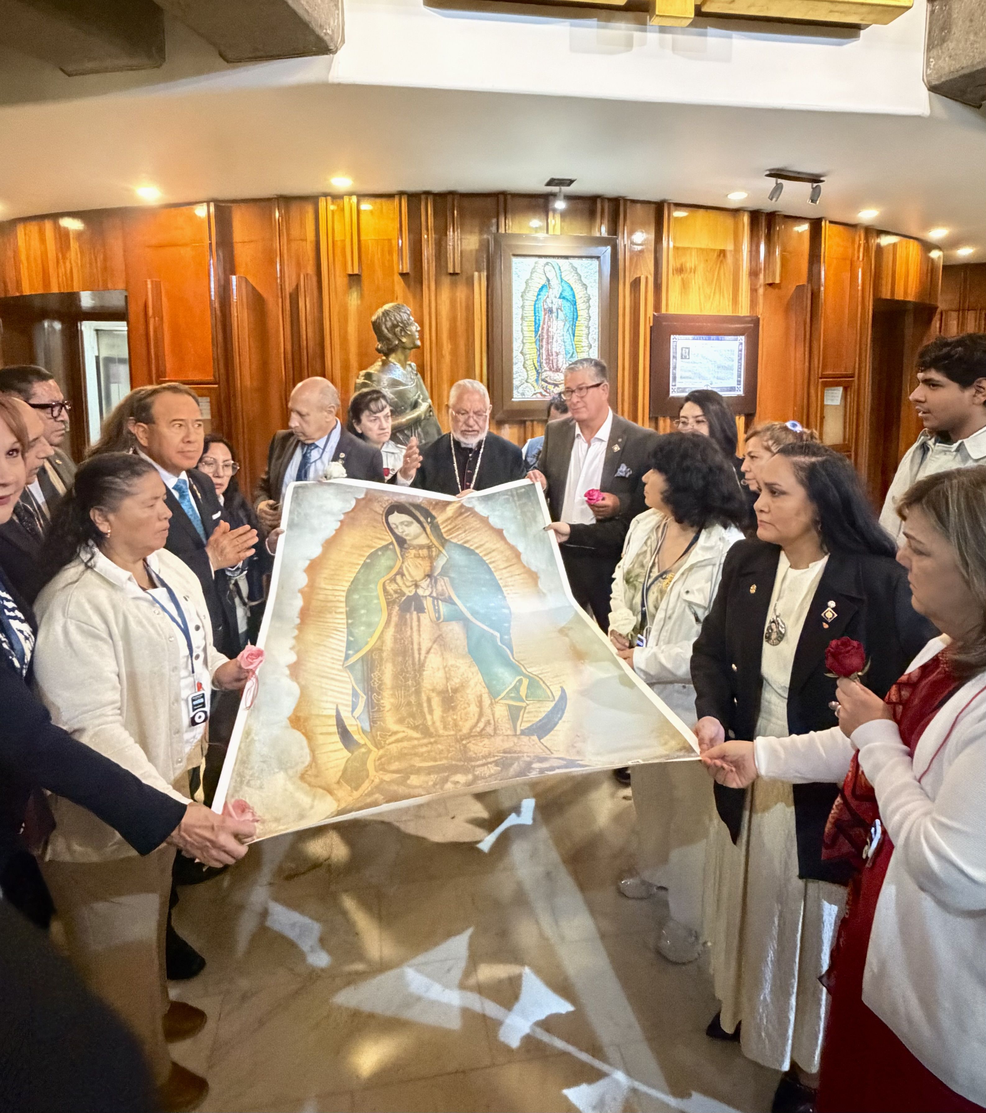 De manera paralela, el Club Rotario Tonantzin Guadalupe e invitados aguardaron en el área de vitrales, acercándose a la imagen guadalupana en un ambiente de profunda emoción. El carácter restringido de estos espacios subraya la relevancia de esta visita, considerada ya como un acontecimiento extraordinario.