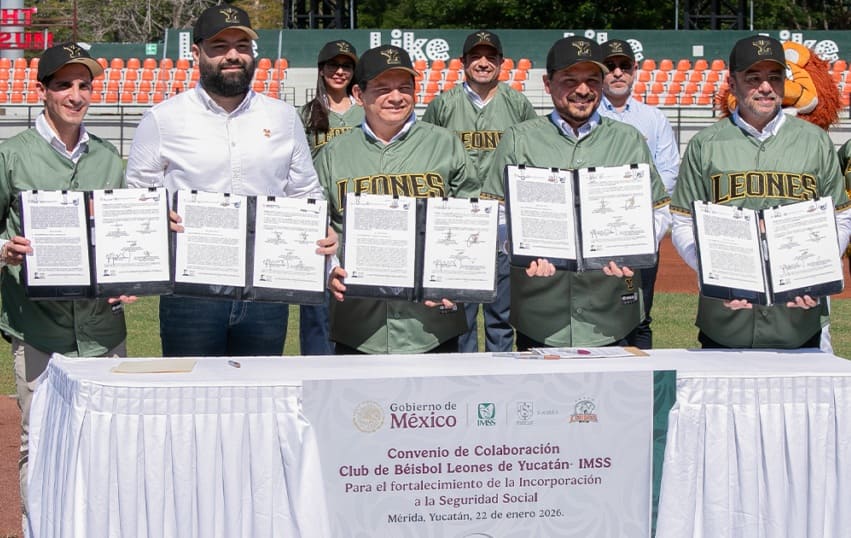 MÉRDA.— El Instituto Mexicano del Seguro Social (IMSS) firmó un convenio de colaboración con el club de béisbol Leones de Yucatán para promover la incorporación voluntaria de Personas Trabajadoras Independientes (PTI) o por Cuenta Propia al Régimen Obligatorio del Seguro Social, y con ello ampliar la cobertura de la seguridad social, garantizar el acceso a servicios de salud y a diversas prestaciones.