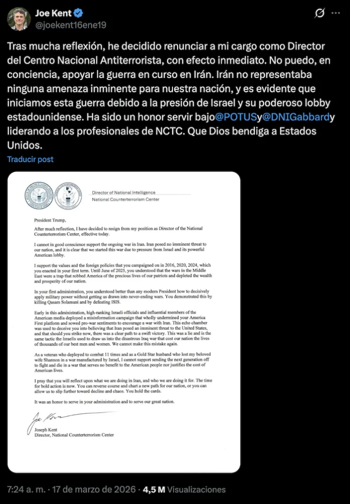 “No puedo, en conciencia, apoyar la guerra en curso contra Irán”, escribió Kent en su cuenta de X, donde compartió una captura de pantalla de su carta de renuncia dirigida a Trump. “Irán no representaba una amenaza inminente para nuestra nación, y está claro que iniciamos esta guerra debido a la presión de Israel y su poderoso lobby estadounidense”.