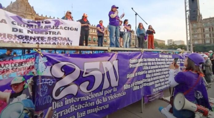 CIUDAD DE MÉXICO / SemMéxico.- La marcha 25N, llegó a las 17:45 a la plancha del zócalo; 7 oradoras en el templete. La demanda: Justicia, no impunidad, hartazgo por 2 mil 700 feminicidios en un año; 28 mil desaparecidas en 9 meses; malas investigaciones y carpetas de investigación llenas de moho como materia muerta en escritorios y computadoras.