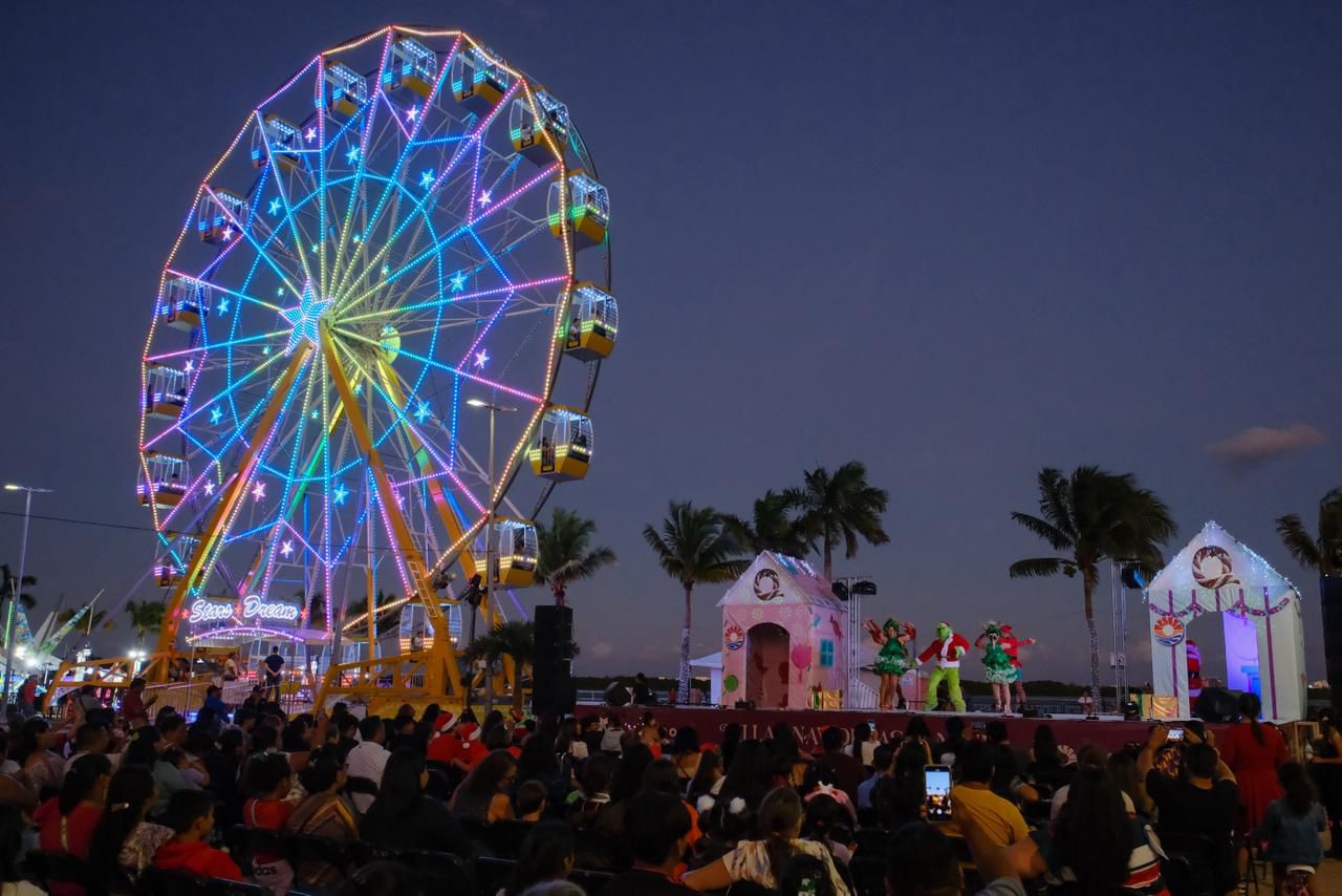 Además, se cuenta con una espectacular rueda de la fortuna, bien iluminada y atractiva. Un árbol navideño, una feria, el back fotográfico y un elenco artístico y cultural. Las villas navideñas, denominadas Villa Cancún Dulce Navidad, estarán abiertas de 5 de la tarde a 10 de la noche.
