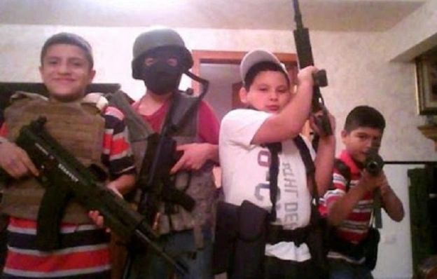 Las Armas de Fuego. Son vistas no como en el pasado donde ver, tener y usar un arma era casi un tabú, ahora no, en estos tiempos de violencia cualquiera puede tener un arma y mostrársela a un niño personalmente, en televisión, en los videojuegos para adultos o en la música donde cantan para el narcotráfico. Y no solamente queda ahí, sino que, parte de la sociedad hace apología con ello al narcotráfico, de ahí el niño lo ve y lo aprende.