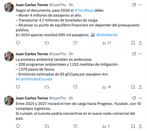 Además, de acuerdo a su plan institucional 2025-2030, publicado en el Diario Oficial de la Federación, se prevé que para ese año, el Tren Maya se esté consolidando como un medio de transporte de carga, moviendo un aproximado de 4.7 millones de toneladas anuales.