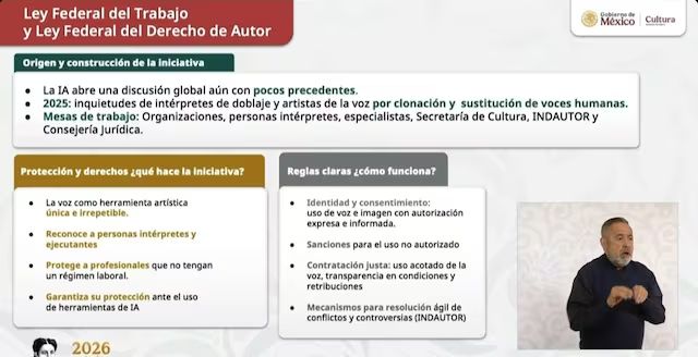 La propuesta de la reforma a la Ley Federal de Derechos de Autor, reconoce legalmente la voz humana como herramienta artística “única e irrepetible”, esto ante los riesgos que existen ante la clonación de voz de los actores de doblaje mediante la IA.