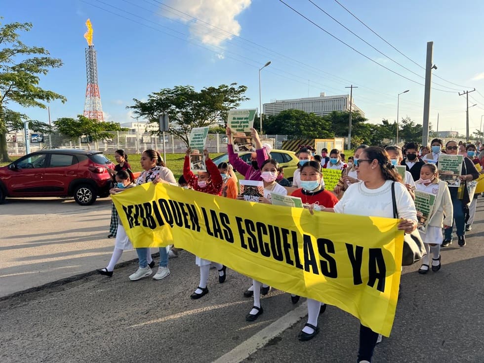 PARAÍSO.— Padres de familia y alumnos de dos escuelas cercanas a la Refinería Olmeca de Dos Bocas, en Paraíso, Tabasco, se manifestaron este lunes 9 de febrero frente a las instalaciones para exigir la reubicación de los centros educativos ante los riesgos que corren los estudiantes.