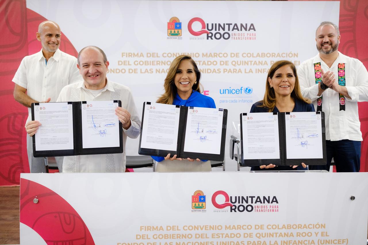 CANCÚN.— En un paso firme hacia la protección integral de la niñez y adolescencia, el Gobierno de Quintana Roo y el DIF estatal firmaron un convenio de colaboración con el Fondo de las Naciones Unidas para la Infancia (Unicef), con el propósito de fortalecer las acciones orientadas al respeto, garantía y promoción de los derechos de niñas, niños y adolescentes.